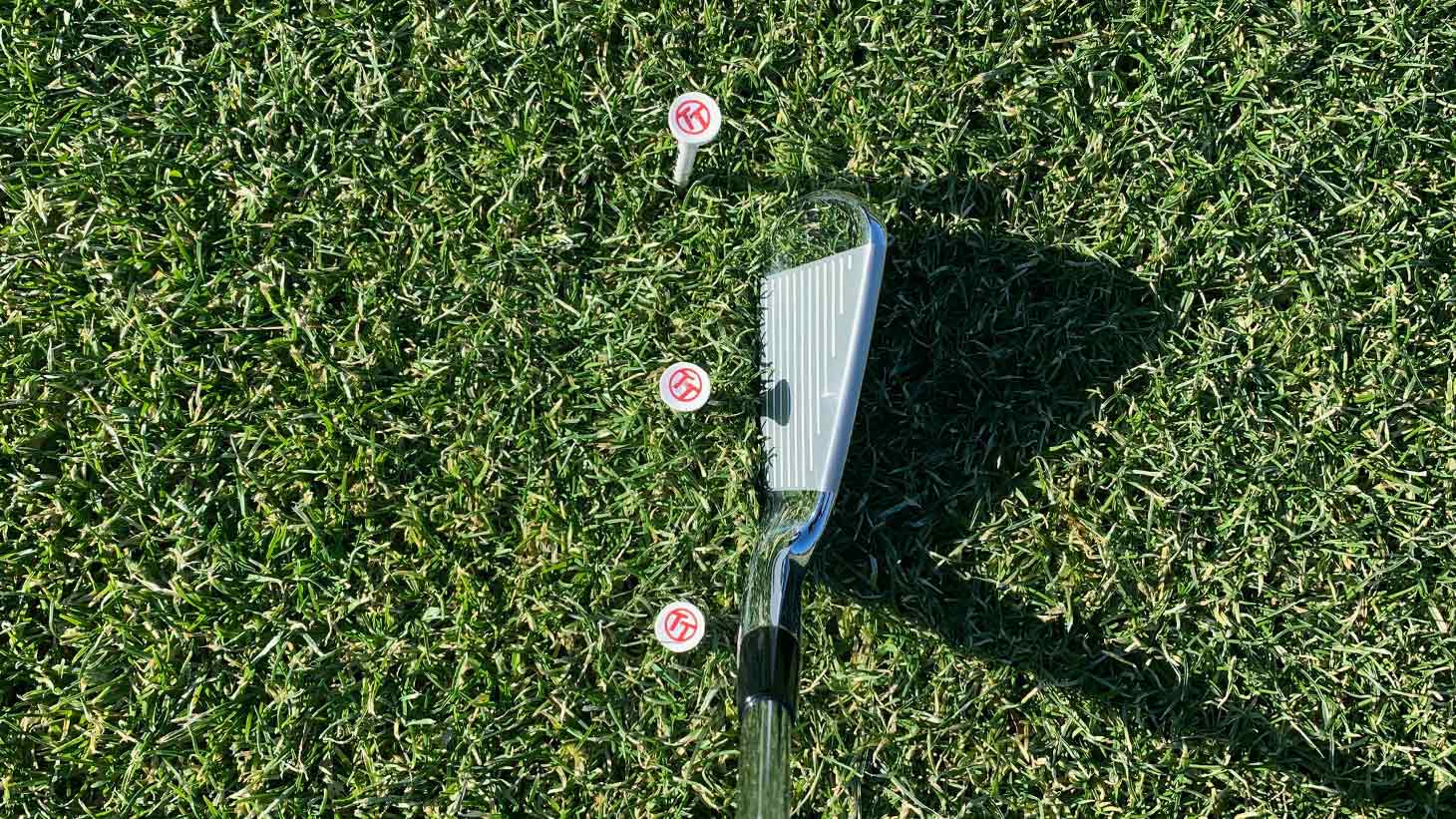 Set up a laneway using three tees as seen in the photo above. The middle tee is your target, what you’ll be trying to strike. The other tees serve as barriers, forming a gate or laneway through which you will attempt to swing. Make sure to push the tee closest to you almost all the way down into the ground so that it does not catch the hosel of the club. The width of the outer tees will vary based on your skill level. Start off with about half an inch of space between the outer tees and the toe and heel of your club.