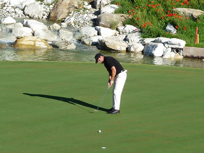 Pro V1x loyalist, Jose Maria Olazabal, rolling his Pro V1x on the new 13th green