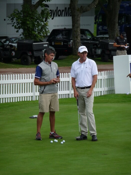 Pro V1x loyalist Anders Hansen chats to his caddie on the putting green.....