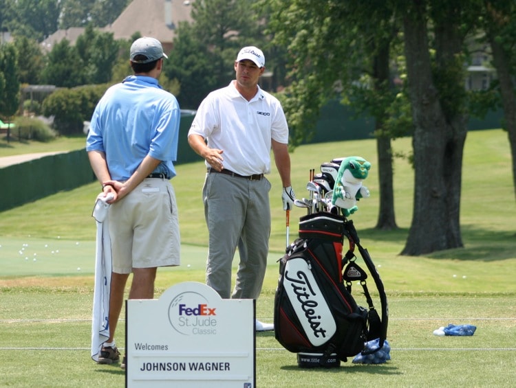 Titleist Brand Ambassador Johnson Wagner, a winner earlier this season at the Mayakoba Golf Classic, chats with his caddie on the range at TPC Southwind.