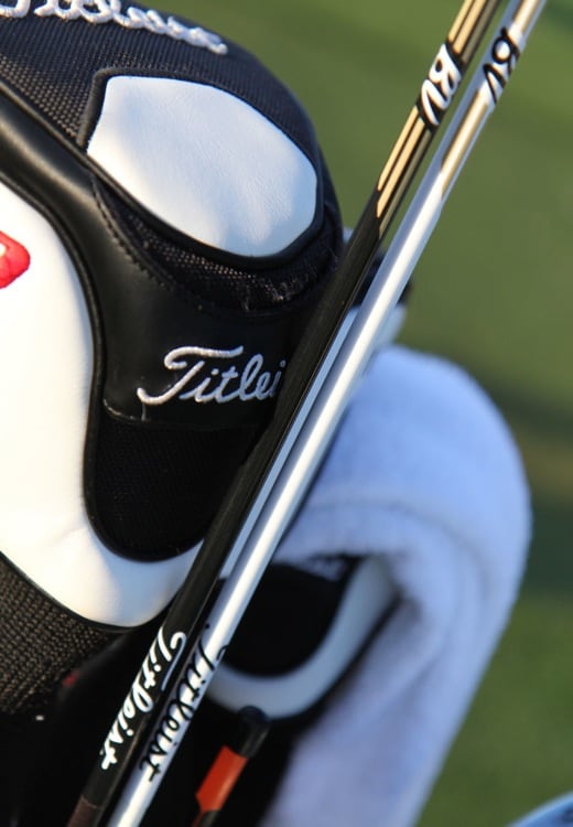 Check out Bobby's prototype alignment sticks with the Titleist and Vokey BV Wings logos.