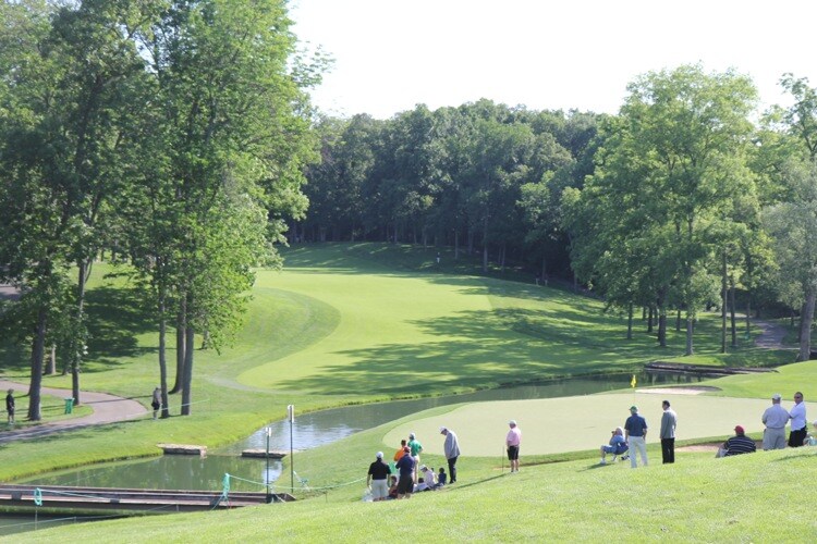 The beautiful 9th hole. The tilted green is framed by a lake, a creek, a forest and a large hillside and must often be approached from an uneven lie, even off a good drive. One of many strong par 4s at Muirfiled.
