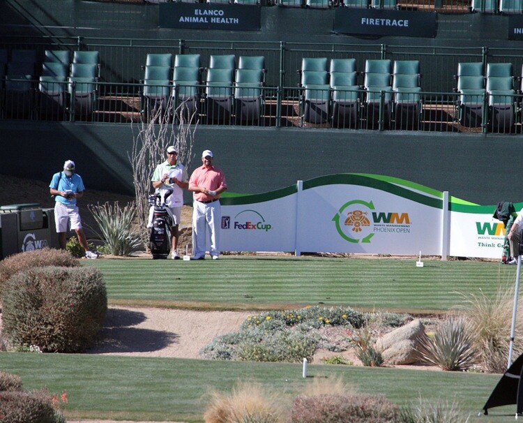 Out on the course, Titleist Brand Ambassador Brendan De Jonge gets ready to hit his tee shot at TPC Scottsdale's par-3 16th, perhaps the most exciting hole in golf.
