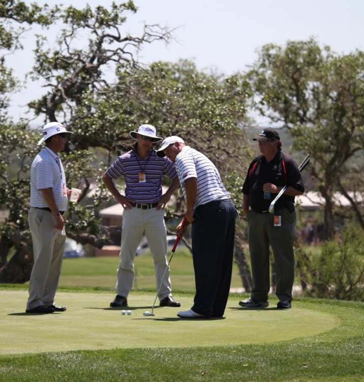 Titleist Brand Ambassador Brendon de Jonge talks shop with Scotty Cameron Tour Rep Larry Silveira.