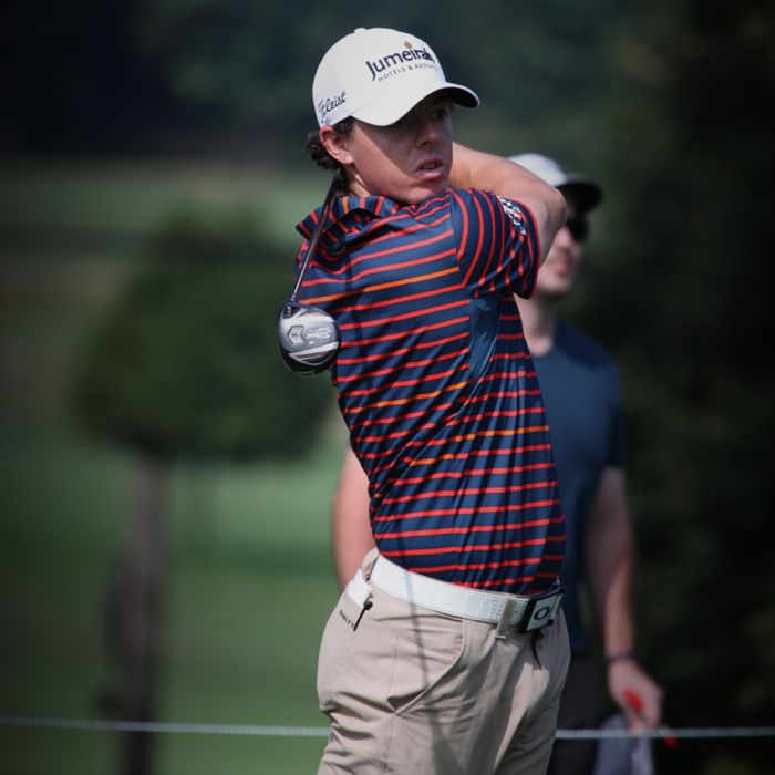 Rory McIlroy tees up a prototype 913 fairway on the second hole of the Black Course in Wednesday's practice round.