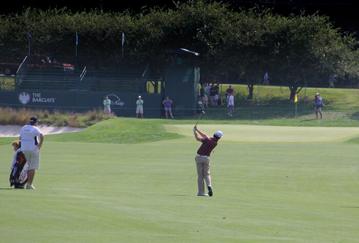 Rory takes aim and fires at the pin.