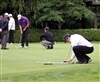 Titleist Brand Ambassador Bobby Gates works on a one-handed putting drill with the help of Titleist Tour Rep Jim Curran (right).