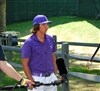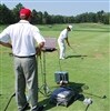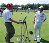 Director of Tour Promotions Chris Tuten checks Na's numbers on the TrackMan launch monitor.