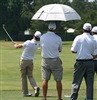 Titleist Brand Ambassador Johnson Wagner, a winner earlier this season at the Mayakoba Golf Classic, chats with his caddie on the range at TPC Southwind.