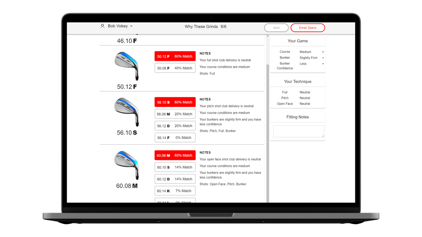 The Vokey Wedge Fitting App focuses on data relating to a player’s angle of attack and their shaft lean at impact. Working in concert with the questions previously discussed with a fitter, the Vokey Wedge Fitting App ultimately recommends specific wedge grinds suited to the player’s technique and course conditions.