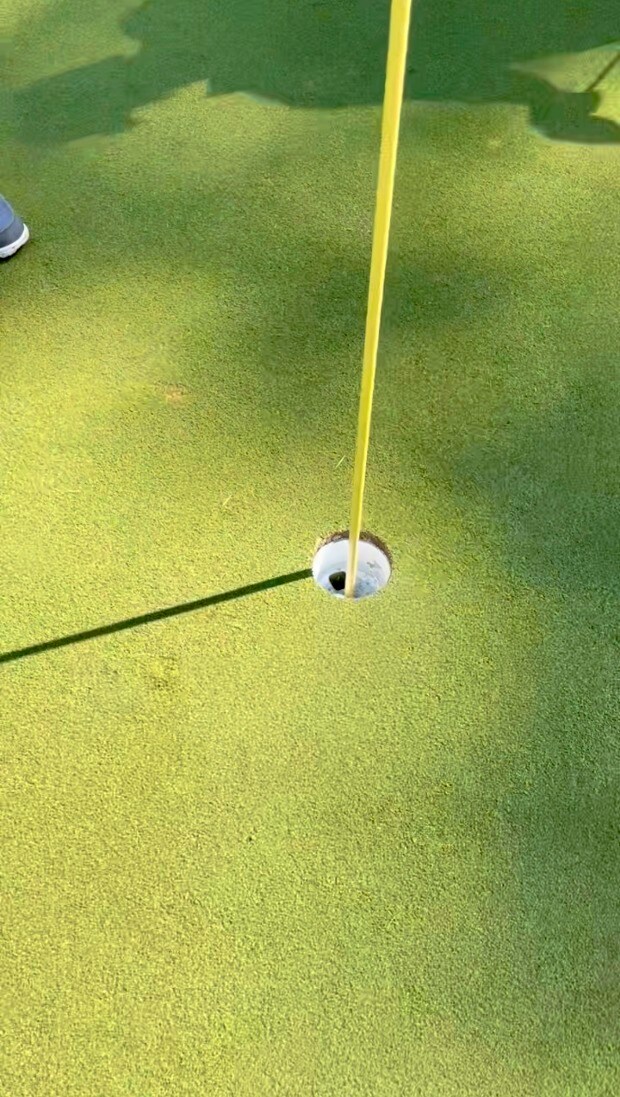 My partner didn't hesitate and said, "hit the 7." I listened (and man am I glad I did). I hit a little draw that was tracking the pin the whole way. What made this even more interesting is that the hole was right at the edge of a shadow. You will see in the 2nd picture that the shadow had moved just enough to uncover the hole by the time we got down there.