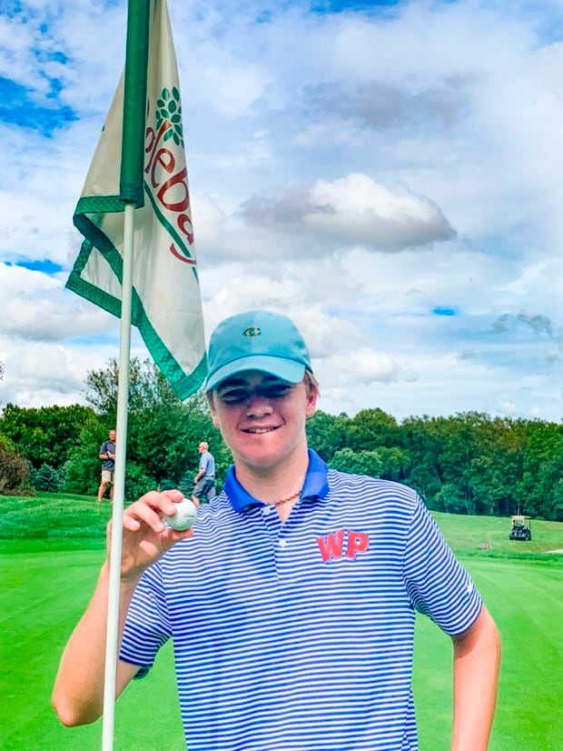 My passion for golf began at the age of five years old and my love of the sport only deepened when I made the varsity golf team last year at Wheeling Park High School. On August 17, 2021 we were playing a match against two other teams on our home course, the Championship Robert Trent Jones at Oglebay Park. On number 11, which is a downhill par 3 with a hazard all along the right side of the green, I pulled out my eight iron and played the shot off the hill on the left. What happened next was amazing and miraculous; the ball rolled down the hill onto the green and coasted into the hole. There was a small gallery, including my grandparents (MO and POP) and two coaches from the other teams. Pop was saying "go in" "go in" go in" and it did! It was a mind-blowing experience. The ball I used was a Titleist Pro V1 which was a "find" from earlier in the round; I am not sure why I pulled it out of my pocket instead of my new Titleist monogrammed Pro V1 (gift from my grandparents) but it will forever be my lucky golf ball. My hope is for our team to again win the state championship this year with my Hole-in-One being a major highlight of the season.