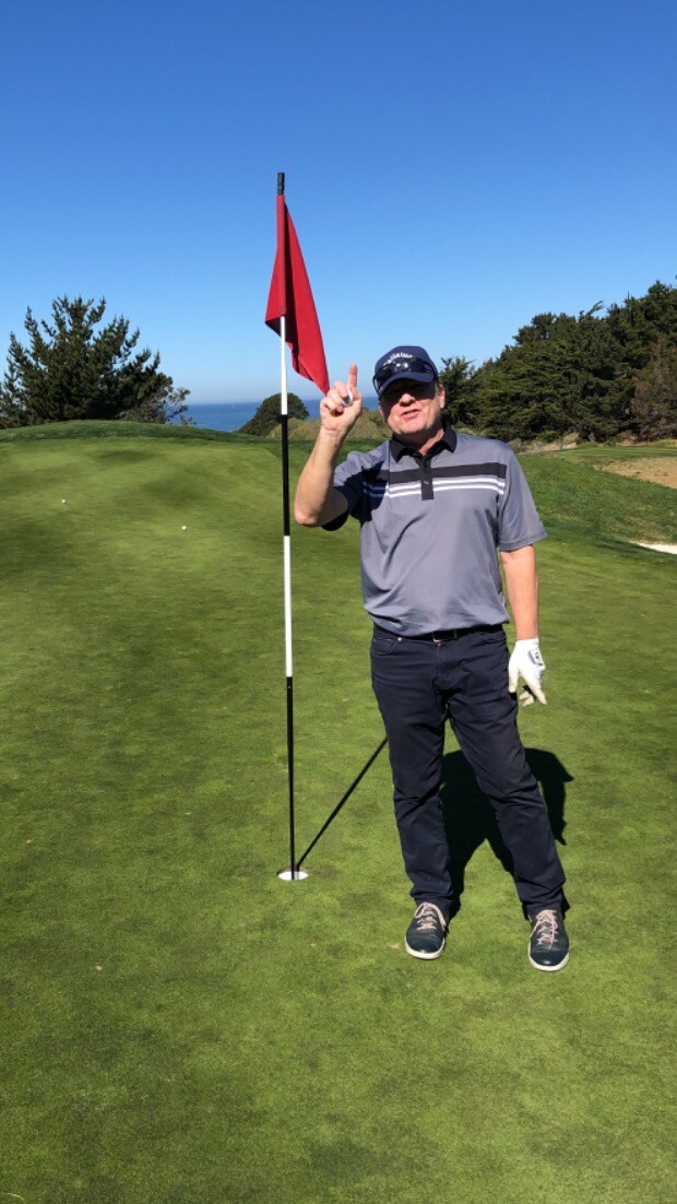 I was playing the beautiful “Links at Spanish Bay” and stepped up to the 13th tee. I took an 9 iron for the 122 yd shot because the wind was blowing from the ocean into me. The shot landed 5’ next to the flag and bounced in. A trill of a lifetime!
