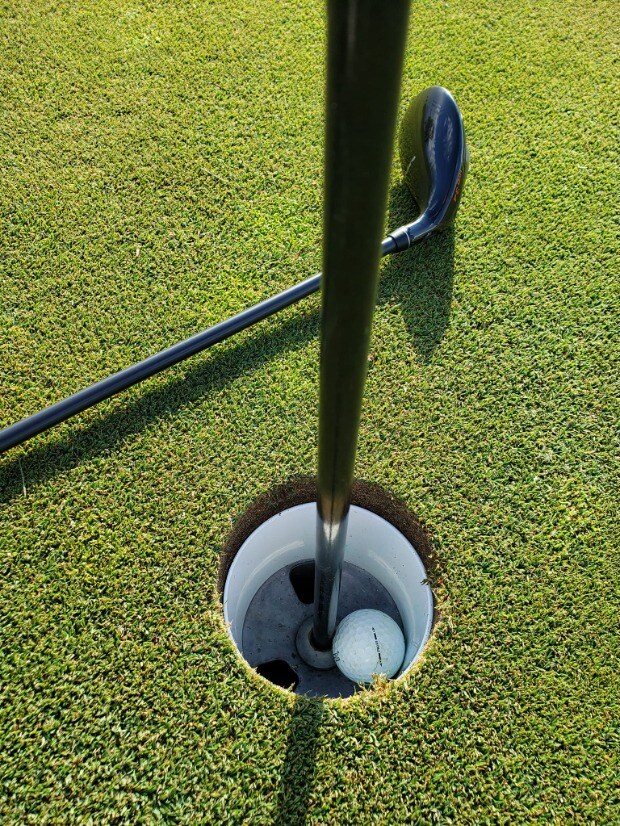 The hole-in-one that happened on the third hole, par three, is 167 uphill with pine trees on the right and left and a sand trap in front of the green. The ball was straight, landed on the fringe, rolled on the green, and seemed to disappear. The skeptical part of me looked first past the green, but I could not locate the ball until I lifted the flag. I used a Titleist ProV1 ball and was thrilled with the shot on Friday, May 27, 2022.