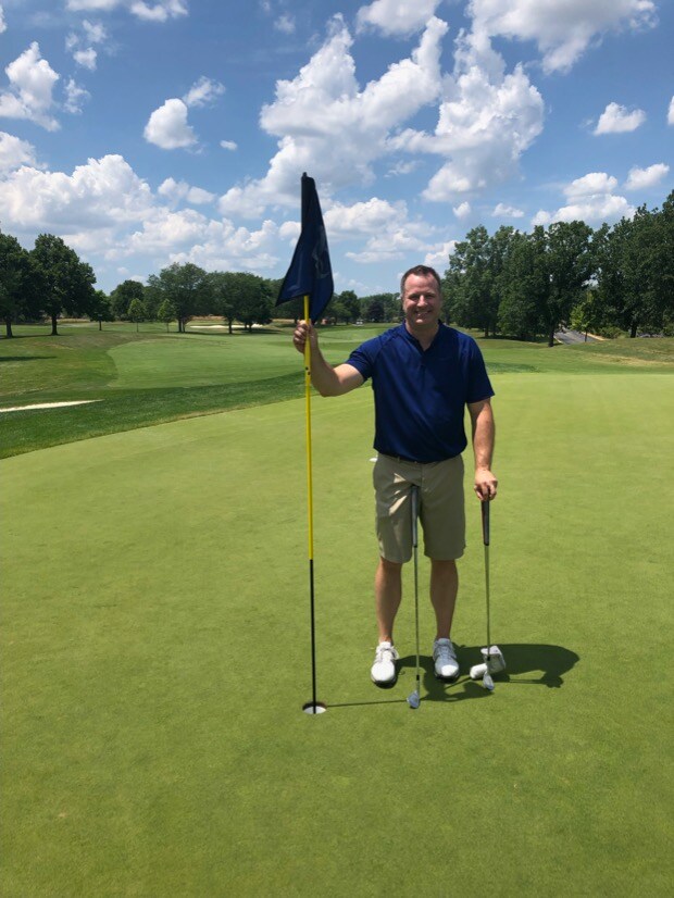 At the Schaumburg Golf Club, Player's Course, hole #4, par 4 316 yards (measured at 280 yards on this day) he hit a 3-wood that landed on the green and rolled in for a hole-in-one and an albatross. He had a good day, shooting 31-39 for a 70 (I shot 90). Great Day!!!