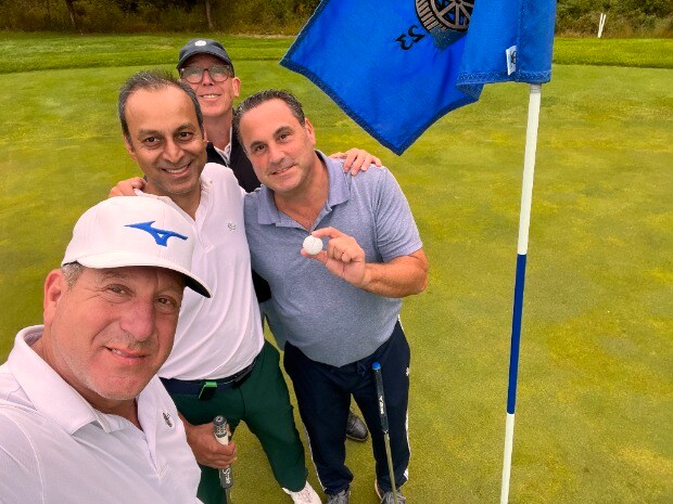 I only play Titleist Pro V1 with #33. I was playing in my men's group in September, 2022 - 14th hole, a 168 yard hole with the pin at the back, at GreenBrook CC in West Caldwell, NJ. Three out of the four of us hit the blind green and when we got to the green only two balls were visible. Mine was missing and I thought I hit and went long and flew the green. While I was searching for my ball, my buddy Sameer checked the hole and sure enough, there it was!