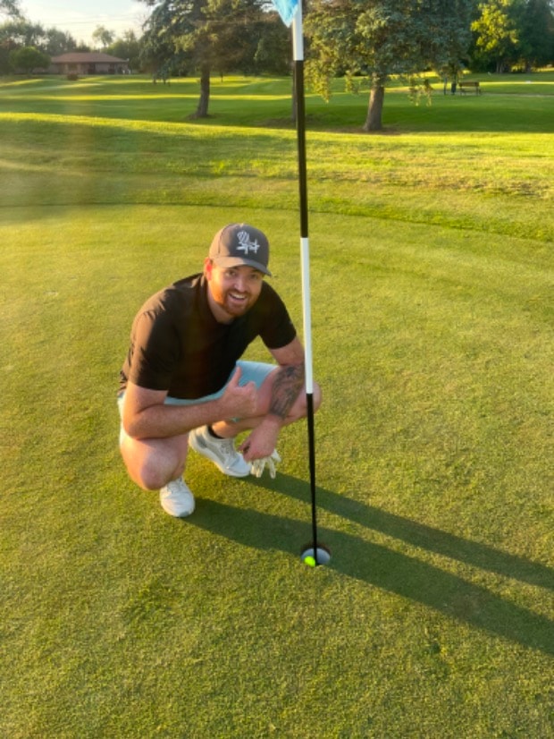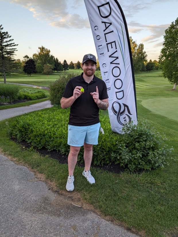 I got to the 17th hole at dalewood golf club the pin was 175 from the tee block and a little hidden behind a hill. I hit the ball low and caught the hill in the right way and broke towards the hole. My best friend starting running toward the green so I started running as well. We dropped out bags while running about half way to the hole, as we got closer we could see no ball on the green. Finally, we could see the yellow ball in the hole and we both started to celebrate, the two guys playing in front of us (who we did not know) ran over and started celebrating with us.