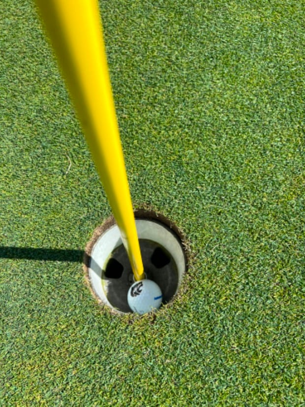 Using my 8 iron I landed on the left side of the green and saw my ball bounce right. Surprisingly, the ball ended up in the cup with the hole on the upper tier.