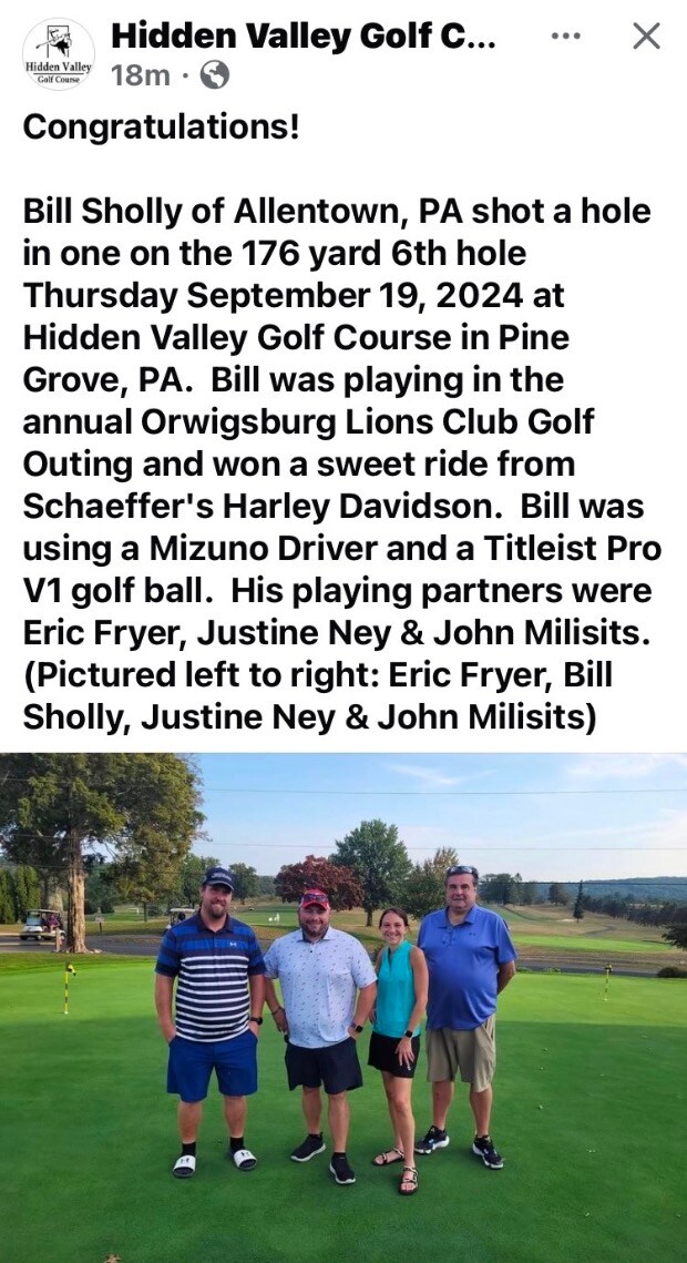 In an unconventional moment, I decided to hit a “light” driver on the last hole of the day. The ball carried about 140yds and rolled down the hill on the fairway, up the hill onto the green. It then disappeared, believing it was hiding behind the flag I did not realize what had just happened. I then went to the green and found the ball in the cup. For being my first hole in one I was elated, then I learned I won a Harley Davidson, Garmin watch and range finder from the hole sponsor. Needless to say it was an amazing moment.