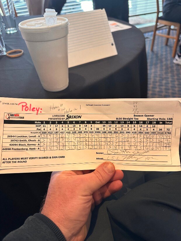 Well it’s taken me 48 years to finally say I have made a hole in one. I played my first tournament of the year with Golfweekamtour, CentralNorth Carolina. Hyland Golf course, Southern Pines, NC. It all happened on #10 Par 3 and I hit a baby fade 7 iron from 170. The ball (Titleist AVX) landed on the green to about 2 feet and the ball rolled into the hole. Today was a good day!!!!