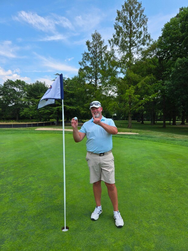 I didn't have my 6 iron for the shot. A 186 yard shot. So I hit a punchy 5 iron instead. It went a little higher than I expected. The ball landed 9 feet in front of the hole, bounced up on the firm green and jumped right in.