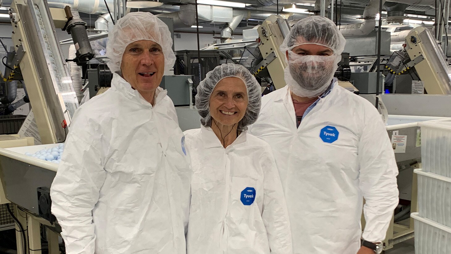 During their visit, the Shannons were given a VIP tour of Ball Plant 3. Here, Steve, Elaine and Steve, Jr. visit clear coat paint operations, where the final glossy touch is applied to Pro V1, Pro V1x, AVX and Pro V1x Left Dash golf balls.